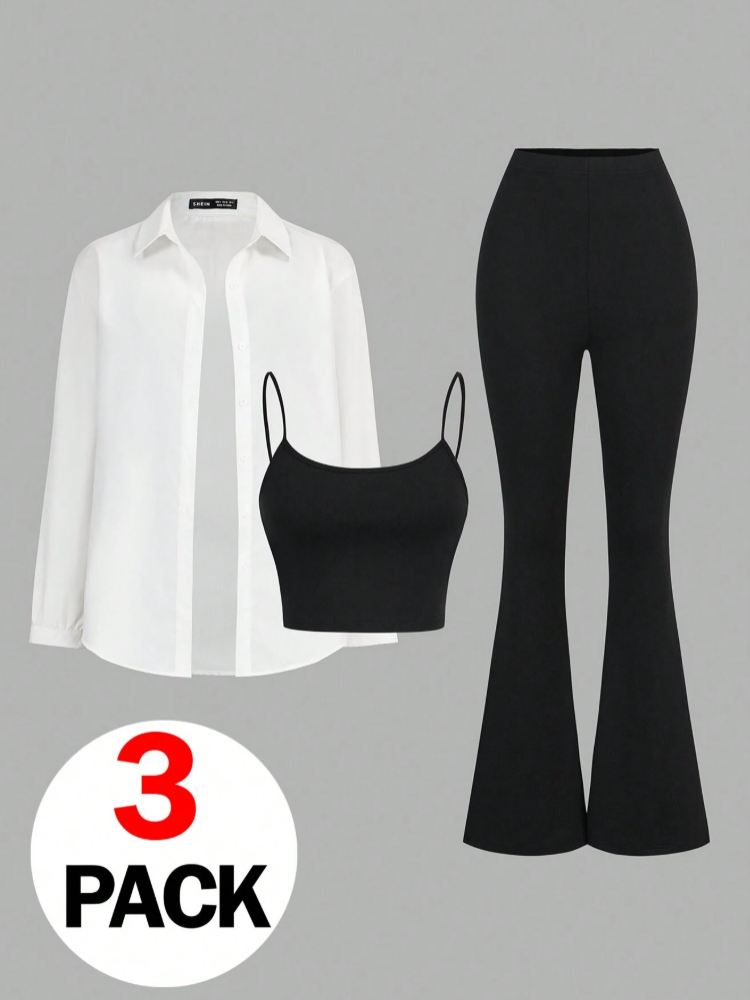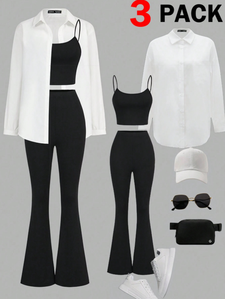 طقم رياضي نسائي كاجوال من ثلاث قطع (قميص، بنطال، وتوب) يجمع بين الراحة والأناقة في تصميم واحد. يتوفر باللونين الأسود والأبيض، ليمنحكِ إطلالة رياضية ومريحة مع لمسة من الأناقة في كل حركة.