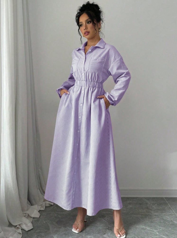 فستان ماكسي قميص مخطط للسيدات، تصميمه العصري والمريح يجعله الخيار المثالي لإطلالة أنثوية وأنيقة في ذات الوقت. متوفر بلونين رائعين، الرمادي الغامق والأرجواني، يناسب مختلف الأوقات والمناسبات.